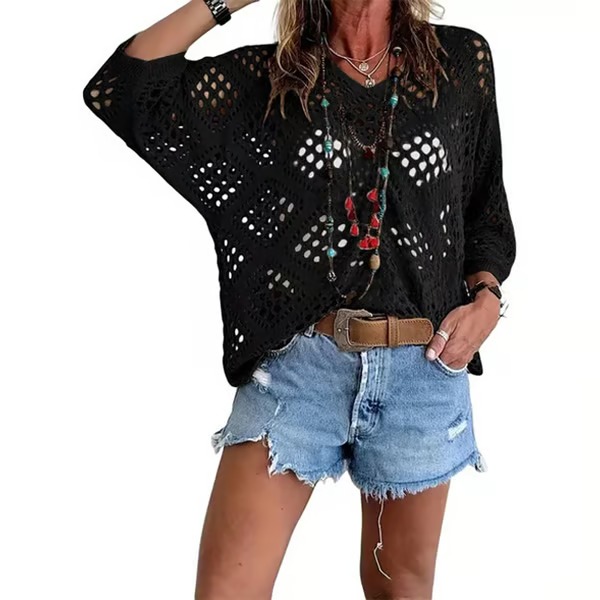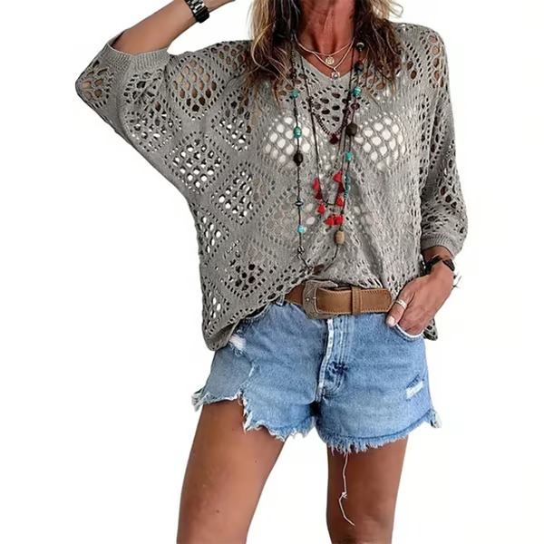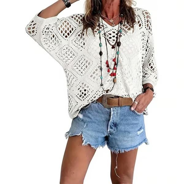 Features a flattering V-neckline, short sleeves, and intricate crochet detailing. Creates a delicate boho-inspired silhouette, combining modesty with sensual allure.